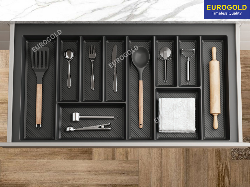 Việc làm bếp sẽ trở nên đơn giản và tiện lợi, tiết kiệm thời gian hơn khi dụng cụ nấu nướng sẽ ngay trong tầm tay bạn bởi một động tác kéo nhẹ nhàng ngăn kéo bếp. Vì vậy đừng bỏ qua việc trang bị một chiếc khay chia thìa nĩa Eurogold cho tủ bếp hiện đại của gia đình bạn.